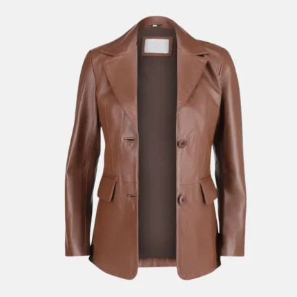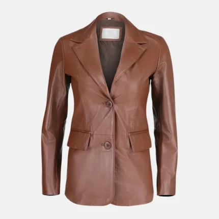 Amelia Women’s Brown Two Button Leather Blazer Jacket with Notch Collar