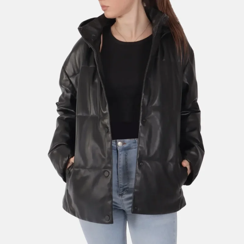Ava Women’s Black Hooded Leather Jacket with Ribbed Cuffs