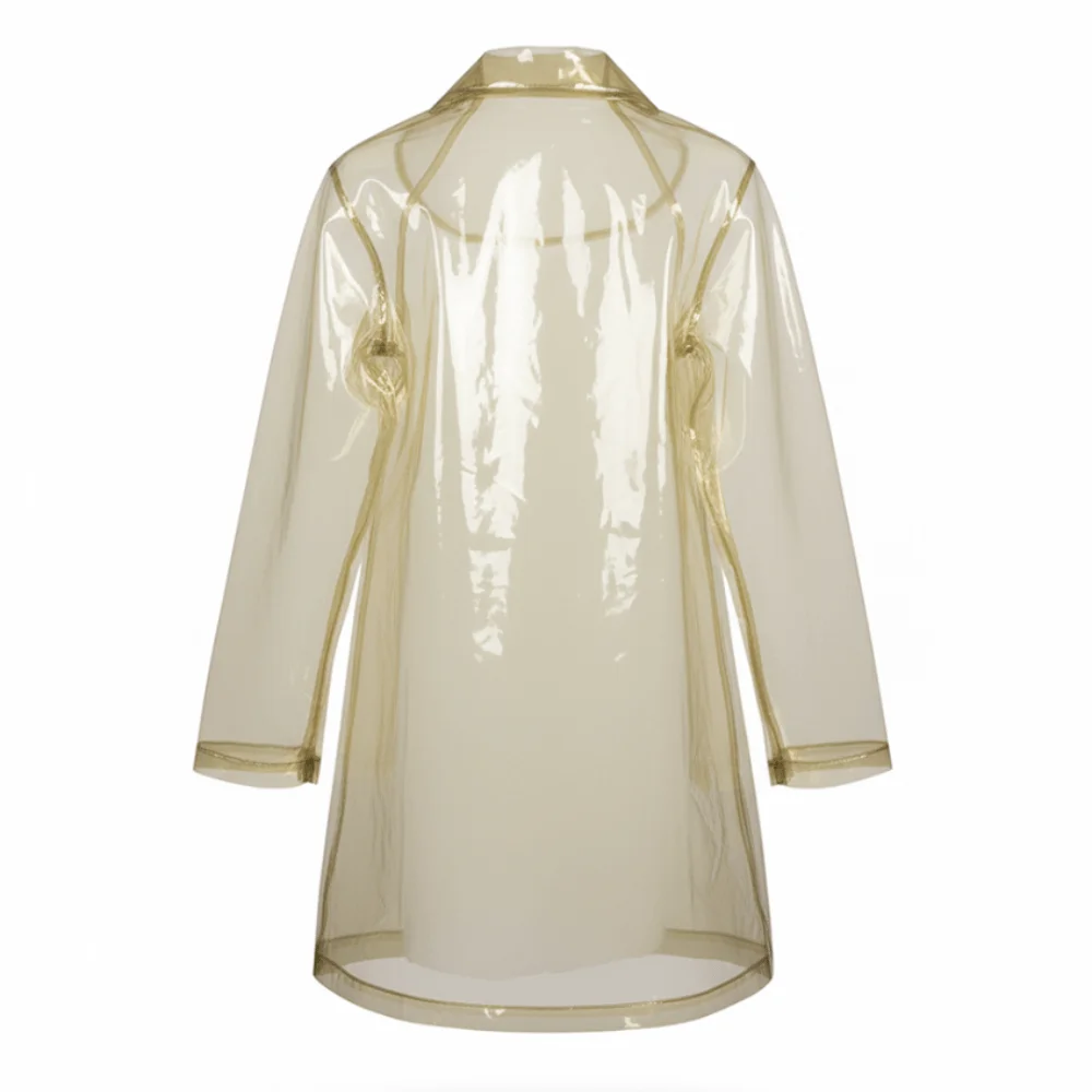 This isn’t just outerwear — it’s wearable art. The PVC material gleams with a subtle golden hue, shifting under city lights like holographic glass. The mid-thigh length gives a modern silhouette, flattering and fluid, designed to accentuate movement while maintaining structure. Its classic shirt collar adds timeless sophistication, balancing futuristic minimalism with familiar tailoring.