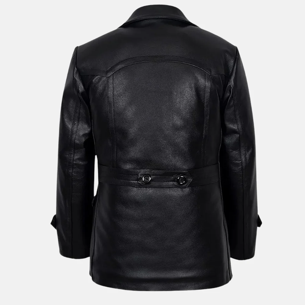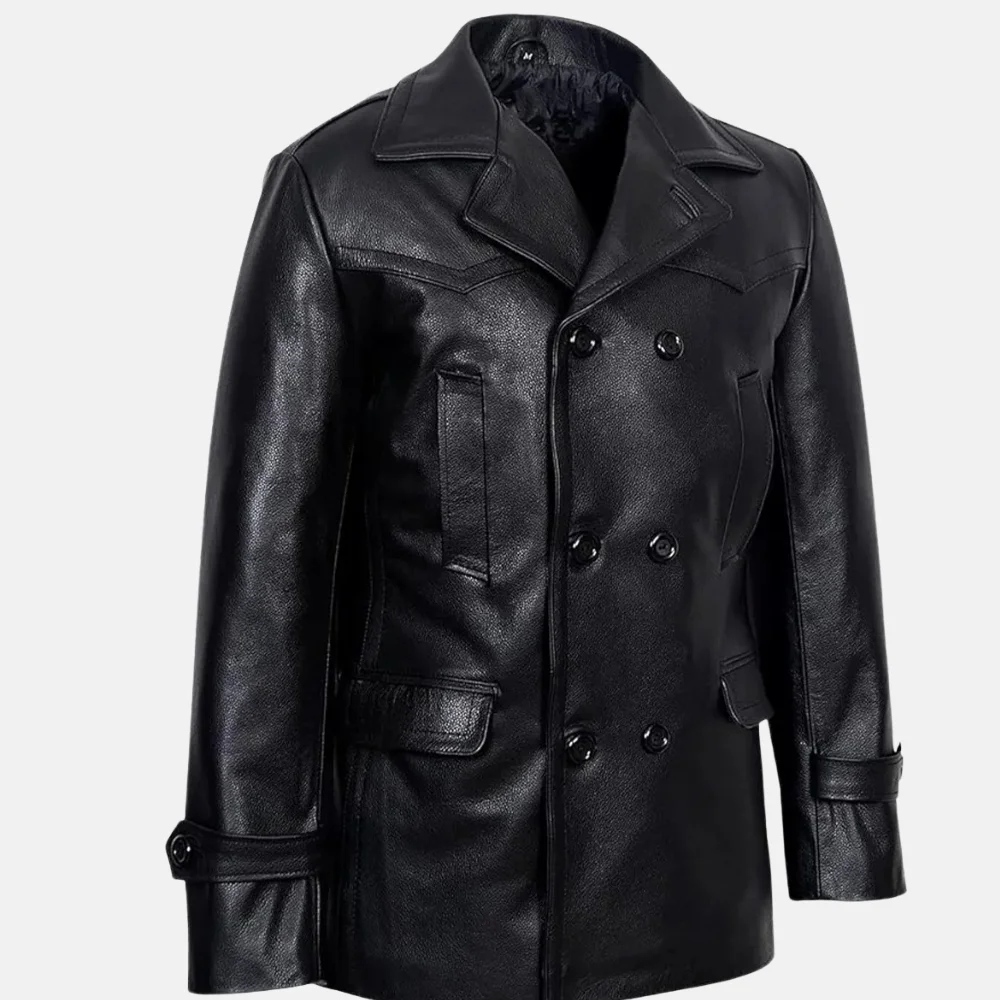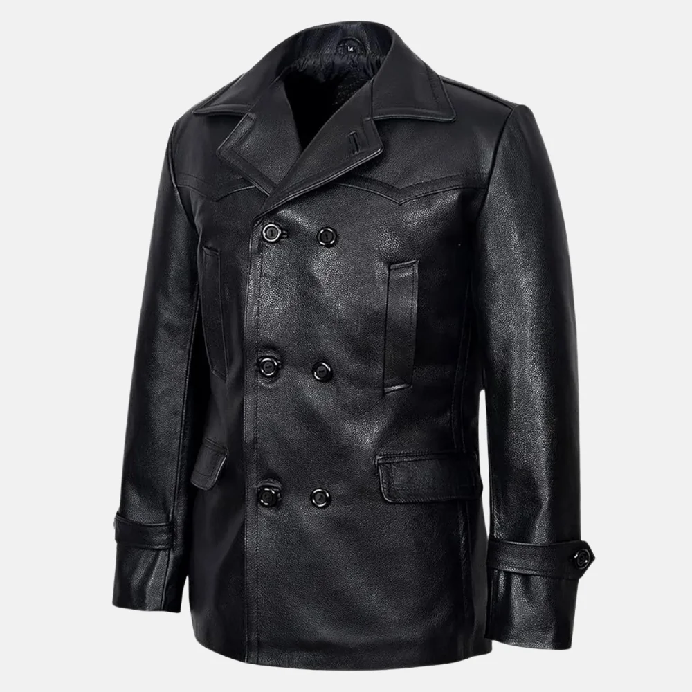 Buy Brandon Men’s Black Double-Breasted Leather Peacoat for Winter Now On Sale