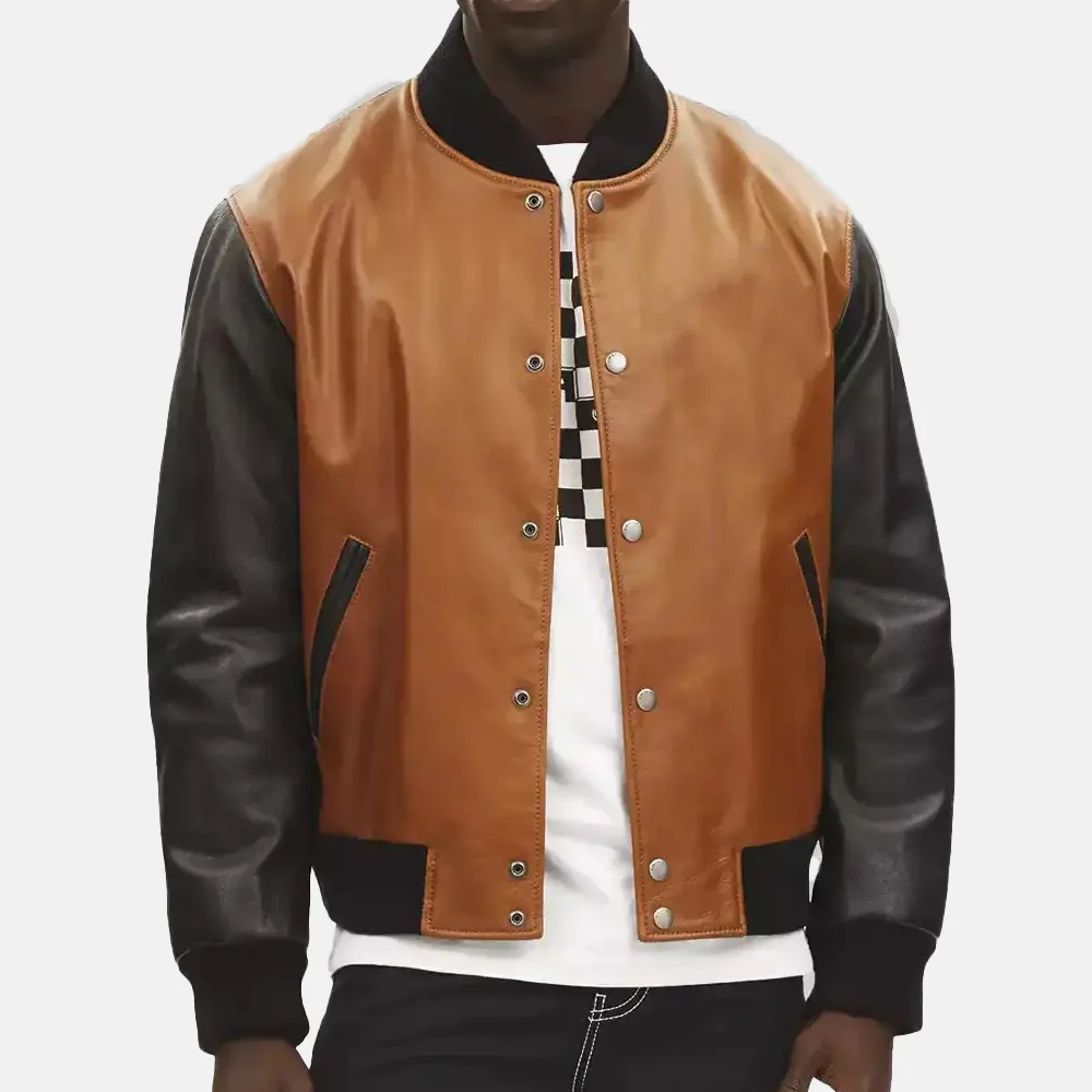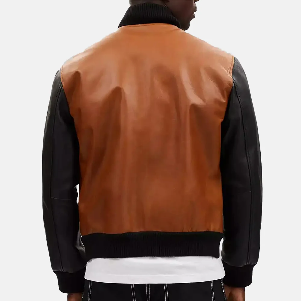 Carter Men’s Brown and Black Leather Varsity Jacket with Ribbed Cuffs