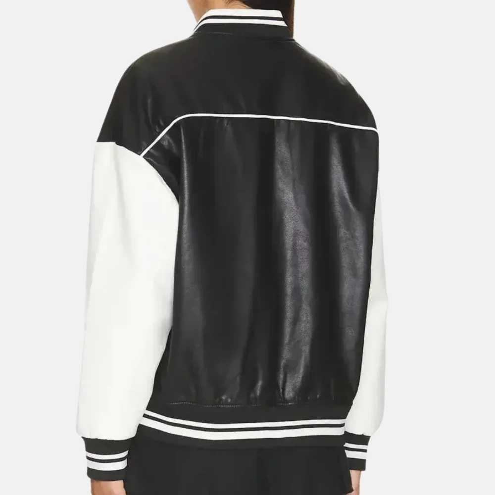 Buy Charlotte Women’s Black and White Leather Varsity Jacket with Logo Now On Sale