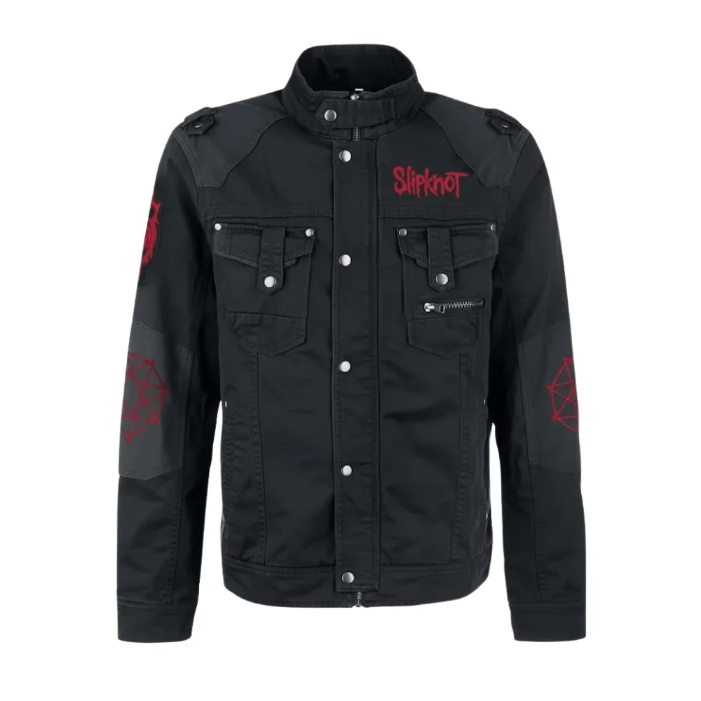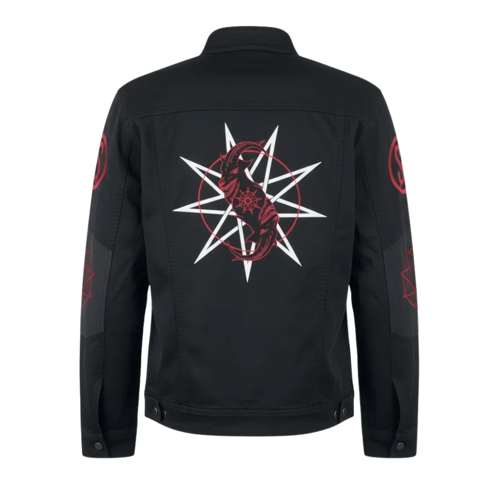 Style: Heavy Metal Band Jacket featuring Slipknot logo and red pentagram symbols on sleeves