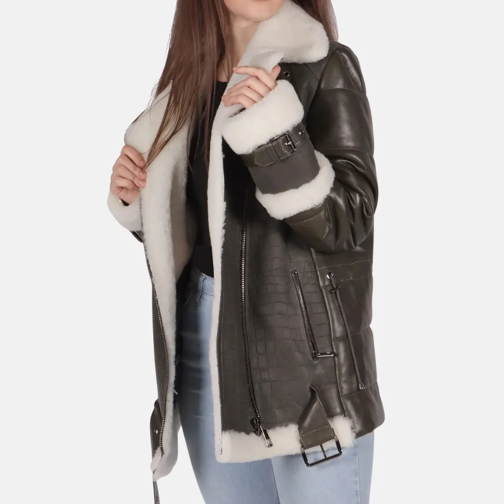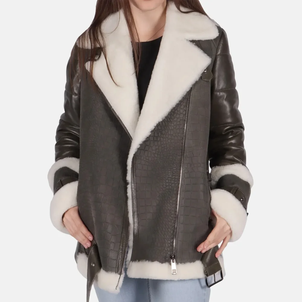 Mia Women’s Grey B-3 Bomber Leather Jacket for Winter Warmth