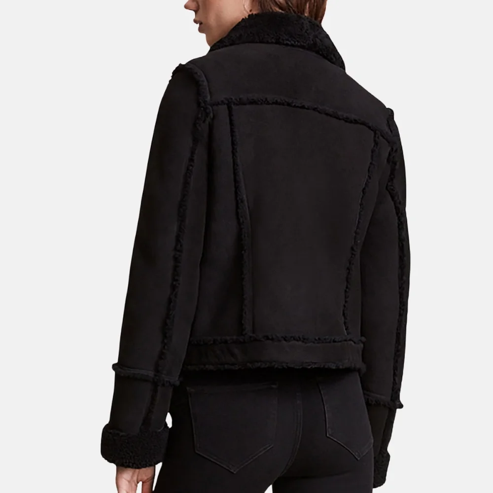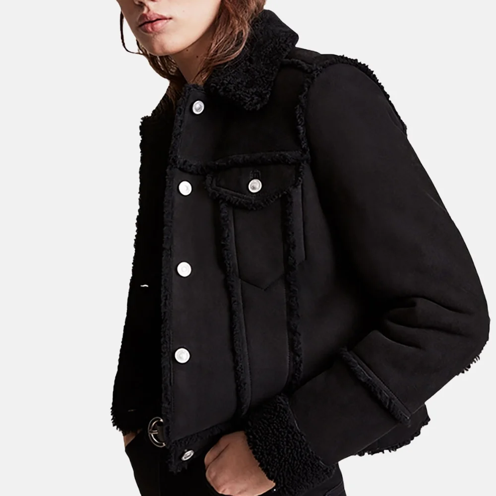 Buy Megan Women’s Black Trucker Shearling Leather Jacket with Fleece Lining Now On Sale