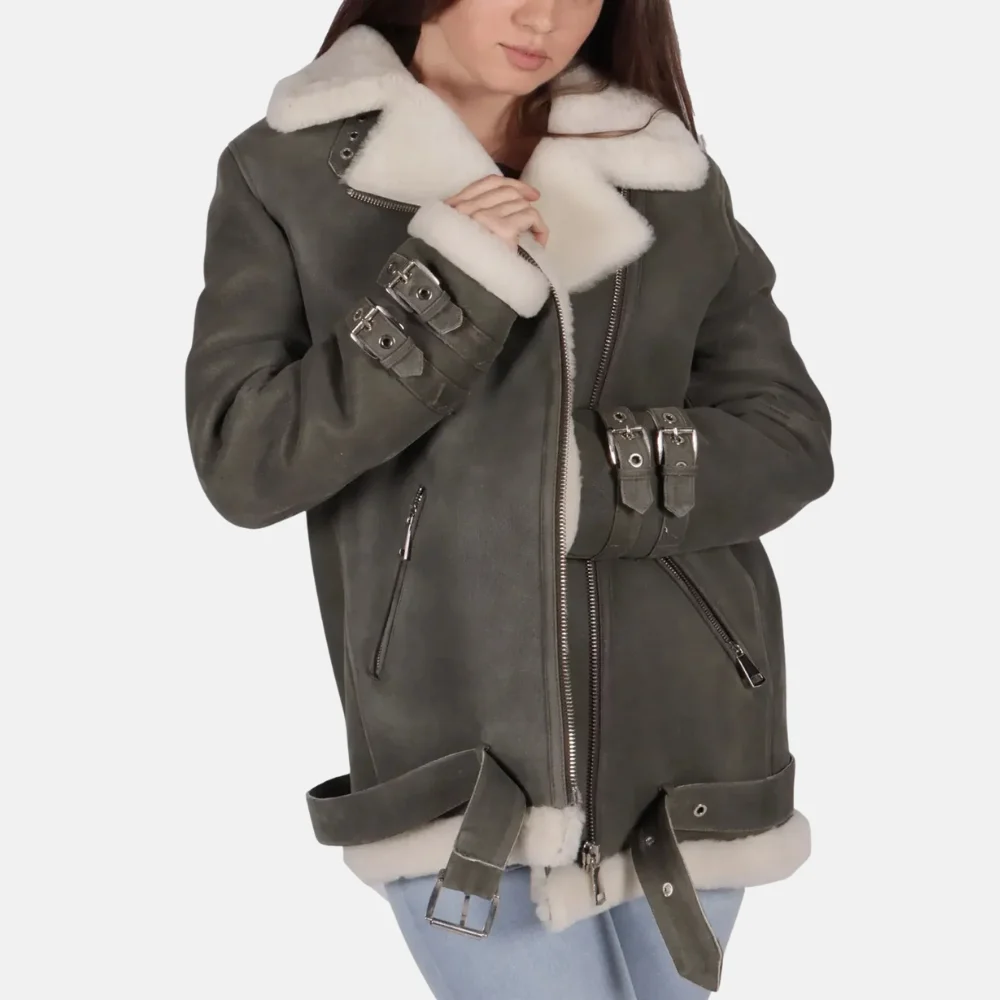 Buy Mia Women’s Grey B-3 Bomber Leather Jacket for Winter Warmth Now On Sale