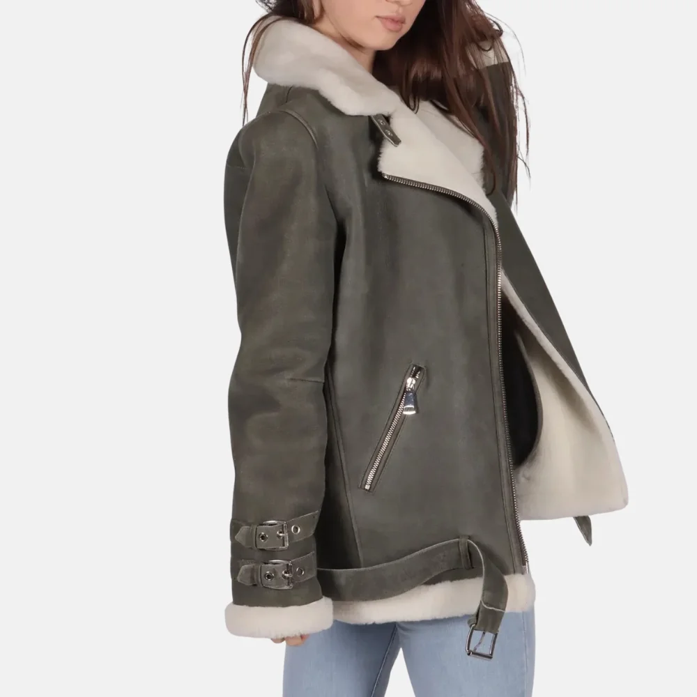 Mia Women’s Grey B-3 Bomber Leather Jacket for Winter Warmth