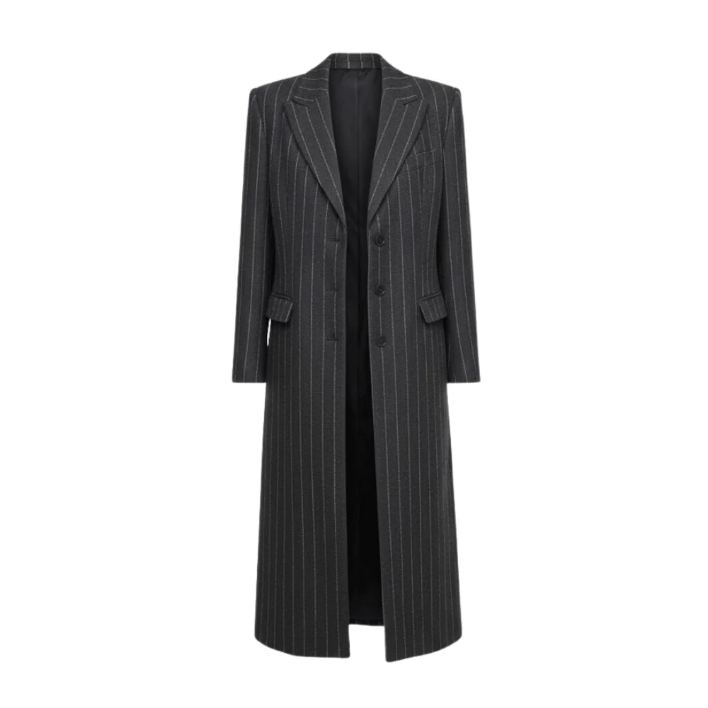 Crafted from a premium wool-blend fabric, it delivers warmth without bulk and structure without stiffness. The charcoal-gray base, elevated with clean white pinstripes, creates a silhouette that feels cinematic, confident, and unmistakably Mabel. The notched lapel frames the face with polished detail, while the full-length drop adds elongation and movement that catches attention in every step.