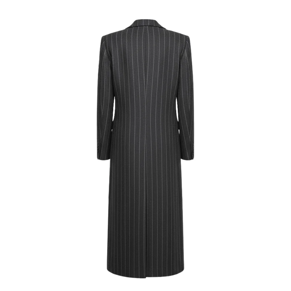 Take it out for crisp evening walks, weekend coffee runs, downtown nights, or any moment when you want effortless sophistication with a touch of mystery. The coat’s length provides added warmth and a clean vertical line that visually refines your outfit. The pinstripe pattern adds subtle dimension—an editorial look without trying too hard.