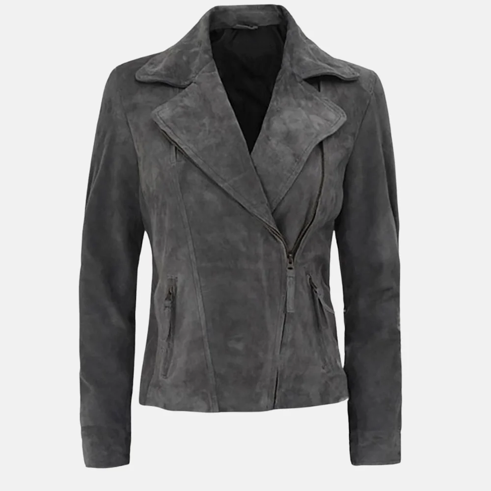 Scarlett Women’s Grey Suede Leather Biker Jacket with Asymmetrical Zip
