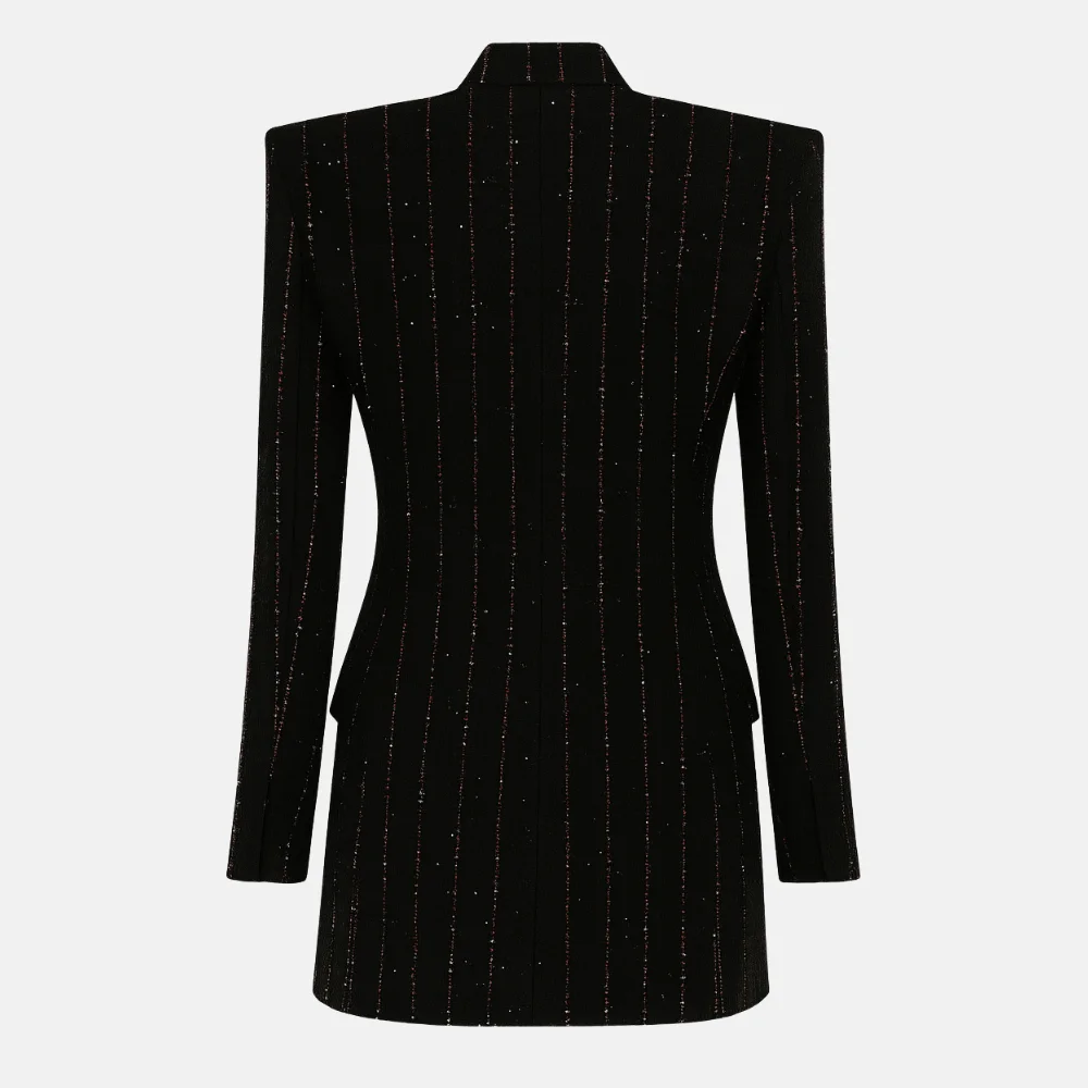 Own the spotlight in the Taylor Swift Black Sequin Blazer by Euphoria Outfits — where classic tailoring meets unapologetic confidence. Crafted for the ones who command attention without saying a word, this tailored black sequin blazer redefines power dressing. Its sleek pinstripe pattern and double-breasted silhouette sculpt a sharp, hourglass fit that feels both structured and sensual.