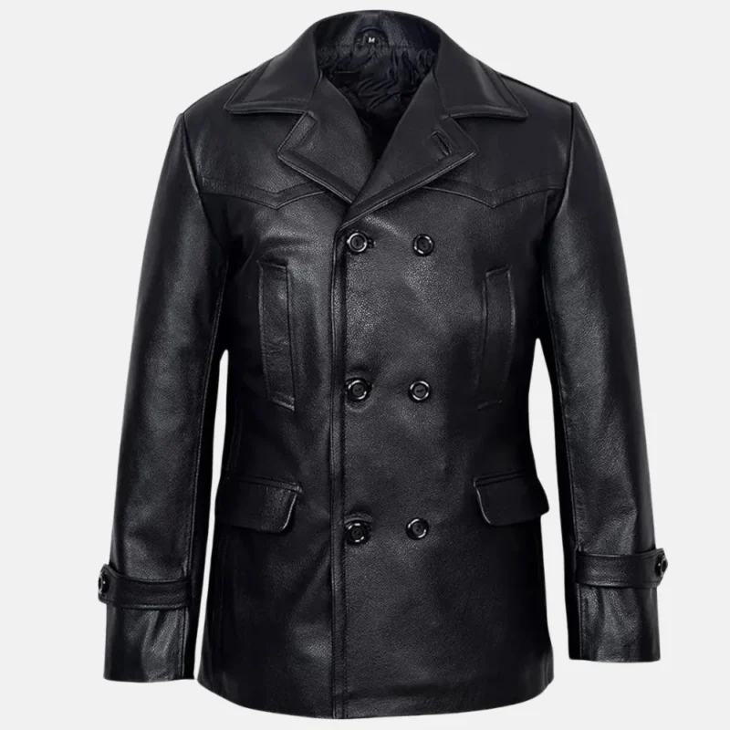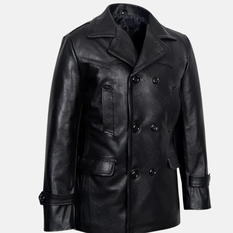 Brandon Men’s Black Double-Breasted Leather Peacoat for Winter