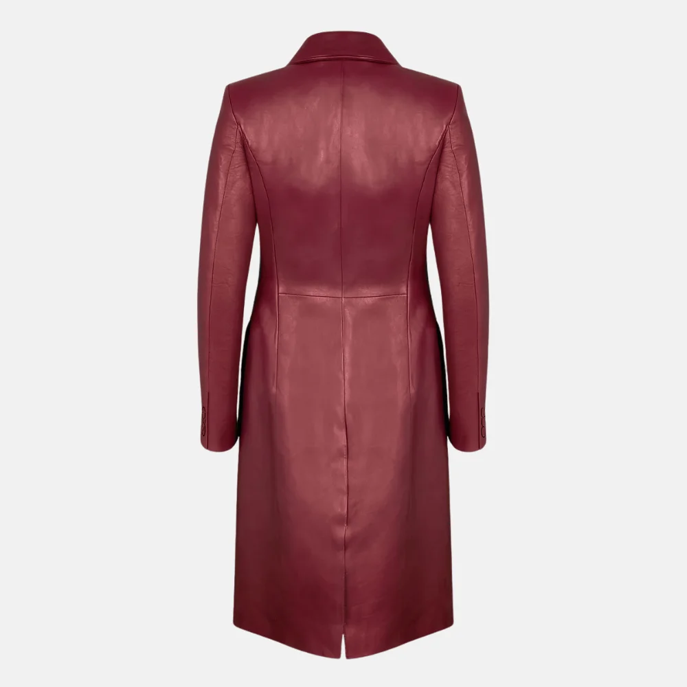 Made for modern icons on the move, this burgundy leather trench coat transitions effortlessly from day to night. Wear it open over a graphic tee and jeans for an urban edge, or belt it tight over a sleek turtleneck for a cinematic finish. The knee-length cut adds versatility and drama, while the supple leather provides all-day comfort without compromising structure.